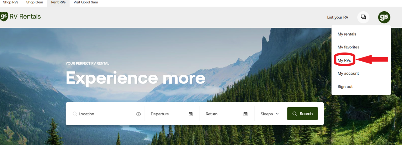 Once you have signed in, click the icon in the top right corner of your screen to open the drop down menu. Select My RVs to navigate to your listings page.