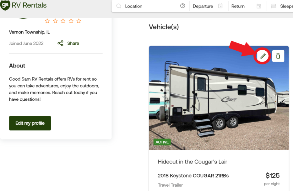 This is your profile and listings page. From here, you can click the 'pencil icon' in the top right corner of your RV listing photo to enter edit mode. You can also edit your user profile from this page by clicking the 'Edit My Profile' button.